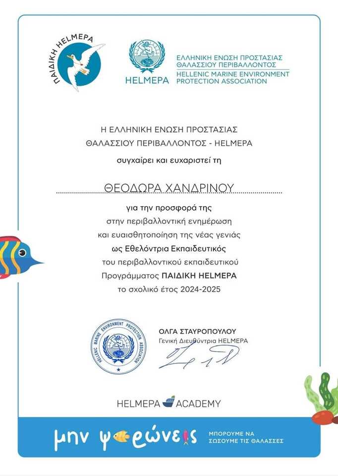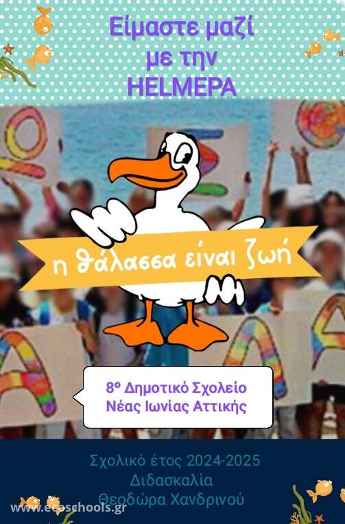 Στο 8º Δημοτικό Σχολείο Νέας Ιωνίας, Αττικής, το σχολικό έτος 2024-2025, συνεργαστήκαμε με τον πιστοποιημένο φορέα HELMEPA, με στόχο την ευαισθητοποίηση των παιδιών πάνω στα Περιβαλλοντικά θέματα που σχετίζονται με την θαλάσσια ζωή!
