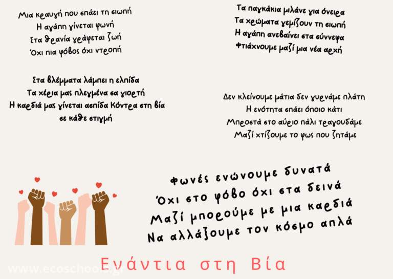 Με σύνθημα “Κανένα παιδί στο περιθώριο”, στοχεύουμε στην ευαισθητοποίηση των μαθητών, της σχολικής κοινότητας και της ευρύτερης κοινωνίας, προωθώντας αξίες όπως η αποδοχή, η φιλία, η ενσυναίσθηση και η συνεργασία.Το δικό μας τραγούδι, με τίτλο “Ενάντια στη Βία”, δημιουργήθηκε με τη βοήθεια της τεχνητής νοημοσύνης και της εφαρμογής Suno, και στέλνει ένα δυνατό μήνυμα ενάντια στον εκφοβισμό και υπέρ της αλληλεγγύης.