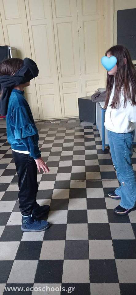 Παράλληλα, τα παιδιά του τμήματος ΣΤ' 1, αφού συζήτησαν για το συγκεκριμένο θέμα με τη δασκάλες τους και έχοντας κάνει αρκετές δράσεις ευαισθητοποίησης στο παρελθόν, βίωσαν και τα ίδια πώς είναι να μην βλέπει κάποιος, μέσω μιας δραστηριότητας στην αγγλική γλώσσα. Σε αίθουσα με τα θρανία στους τοίχους, τα παιδιά σε ζευγάρια, έπαιξαν το παιχνίδι "trust me", δίνοντας οδηγίες στα αγγλικά, στα παιδιά που είχαν δεμένα τα μάτια τους. Τους φάνηκε πολύ περίεργο να μην βλέπουν, διαπίστωσαν όμως πως είχαν πολύ ανεπτυγμένες τις άλλες αισθήσεις τους κι ότι, τελικά, είναι πολύ ωραίο να εμπιστεύεσαι κάποιον... τυφλά!!!