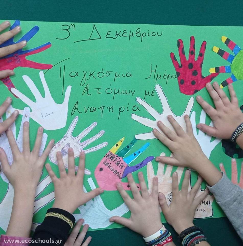 Με αφορμή την 3η Δεκεμβρίου, η οποία έχει ανακηρυχτεί από τη Γενική Συνέλευση του ΟΗΕ ως η Παγκόσμια Ημέρα Ατόμων με αναπηρία, στο σχολέιο μας πραγματοποιήθηκαν σημαντικές δράσεις.. Η ημέρα αυτή αποτελεί μια σημαντική αφορμή για την ευαισθητοποίηση της κοινωνίας και ειδικότερα των παιδιών σε θέματα που αφορούν τα άτομα με αναπηρία και τα δικαιώματα τους, καθώς και την ανάδειξη των δυνατοτήτων τους. Βασικός στόχος είναι η εξάλειψη κάθε διάκρισης και η διασφάλιση της ισότιμης συμμετοχής και ένταξής τους σε όλες τις πτυχές της ζωής, από την εκπαίδευση και την εργασία έως την κοινωνική δραστηριότητα αυτών των ατόμων.