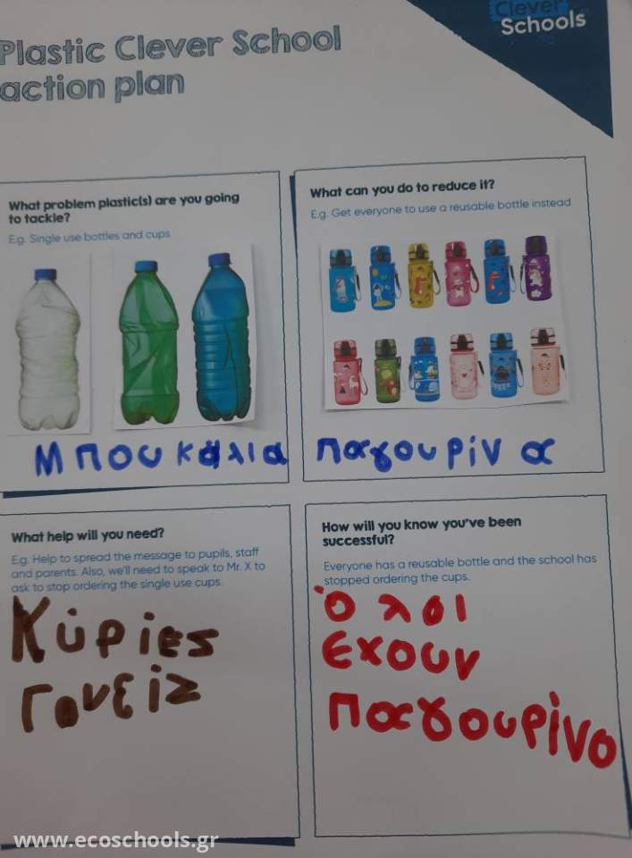 Συμμετέχουμε με διάφορες δραστηριότητες και δράσεις στο φορέα PLastic Clever Schools, ώστε να καταφέρουμε να μειώσουμε τα πλαστικά που χρησιμοποιούμε στο σχολείο μας.