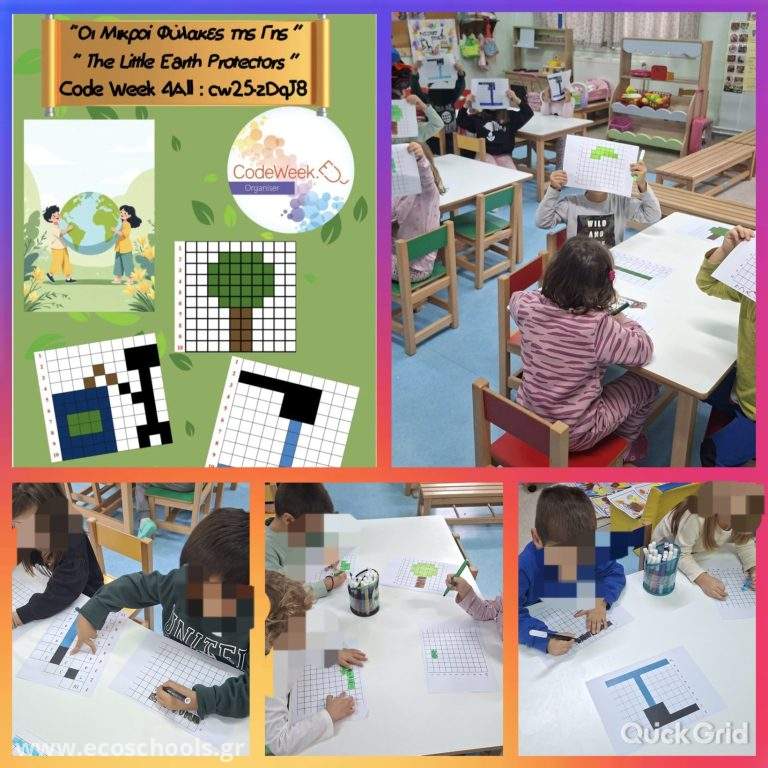 Το νηπιαγωγείο μας συμμετέχει στην εβδομάδα κώδικα Code Week 4all με μια δράση που σχετίζεται με την προστασία του περιβάλλοντος. Αυτή η δραστηριότητα σχεδιάζεται σε pixel art χωρίς εξοπλισμό και καλεί τα παιδιά να γίνουν οι ήρωες του πλανήτη μας. Θα ξεκινήσουν την περιπέτεια με ένα μυστήριο αίνιγμα που θα τους δείξει ποιοι είναι οι φύλακες και ποια η αποστολή τους.