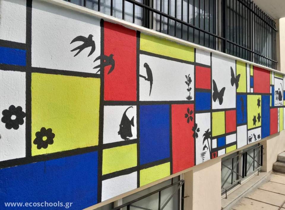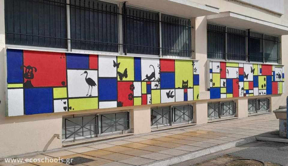 Η τέχνη μαζί με εικόνες από το φυσικό περιβάλλον βρίσκονται σε αρμονία στην αυλή του σχολείου μας. Με αφορμή το έργο του Μοντριάν αλλά και με πρόσθετα στοιχεία ζώων , φυτών και πολύ φαντασία ζωγραφίσαμε την πρόσοψη του κτηρίου στην αυλή του σχολείου μας. Η εικαστικός του σχολείου μας Βασιλική Σιώτη με την βοήθεια εκπαιδευτικών και μαθητών δούλεψαν με κέφι και χάρηκαν τόσο την διαδικασία όσο και το αποτέλεσμα, αναθμιζοντας αισθητικά το σχολειο με χρώματα και εικόνες, στέλνοντας ένα μήνυμα χαράς και αισιοδοξίας στην σχολική κοινότητα, στους περαστικούς και στους κατοίκους της γειτονιάς .