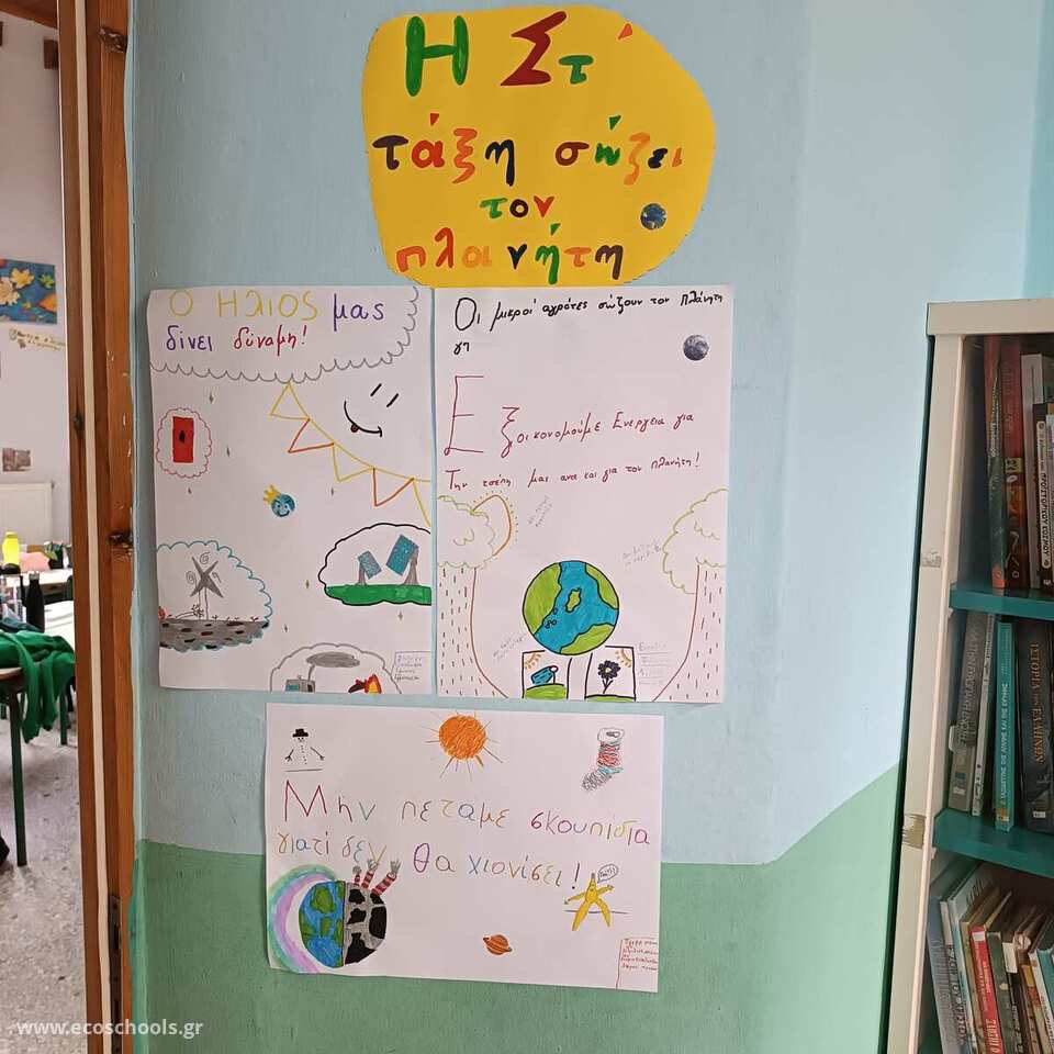 Οι μαθητές της Στ΄ τάξης με αφορμή το μάθημα των Φυσικών για τις ανανεώσιμες πηγές ενέργειας και την εξοικονόμηση ενέργειας, αφού πρώτα έκαναν καταιγισμό ιδεών σχετικά με τη σπατάλη ενέργειας και με ποιο τρόπο θα μπορούσαμε ενα την περιορίσουμε, δημιούργησαν σε ομάδες αφίσες προκειμένου να κινητοποιήσουν και να ενημερώσουν και τους υπόλοιπους μαθητές γύρω από την εξοικονόμηση ενέργειας και την προστασία του περιβάλλοντος. Μάλιστα τα σλόγκαν που σκέφτηκαν οι μαθητές και οι μαθήτριες ήταν ιδιαίτερα ευφάνταστα, όπως "Μην πετάτε σκουπίδια, δε θα χιονίσει", "Ο ήλιος μας δίνει ενέργεια" κ.ά. Οι αφίσες που κατασκέυασαν αναρτήθηκαν στον διάδρομο του σχολείου προκειμένου να είναι ορατές από όλους.