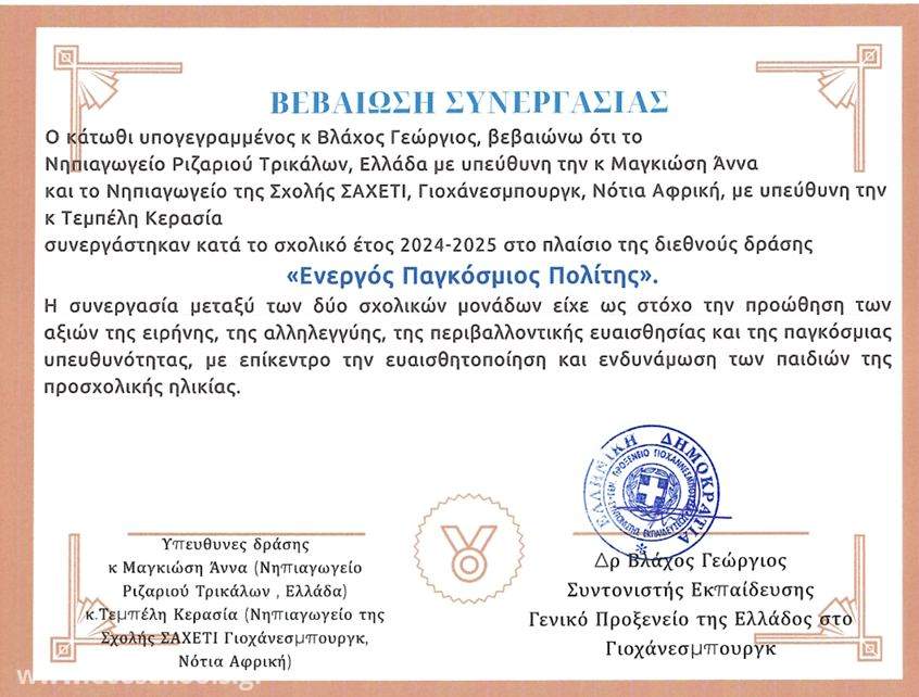 Ήρθε και επίσημα η επιβεβαίωση μιάς υπέροχης συνεργασίας τη χρονιά που πέρασε ,μεταξύ του Νηπιαγωγείου Ριζαριού και της σχολής Σαχέτι (Αφρική) στο πλαισιο της ιδιότητας του παγκόσμιου πολίτη, από τον Συντονιστή εκπαίδευσης του Προξενείου Ελλάδας στο Γιοχάνεσμπουργκ, κ. Γεώργιο Βλάχο ,τον οποίο ευχαριστούμε θερμά για την υποστήριξή του.