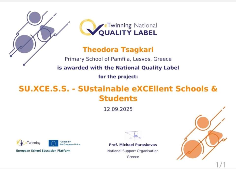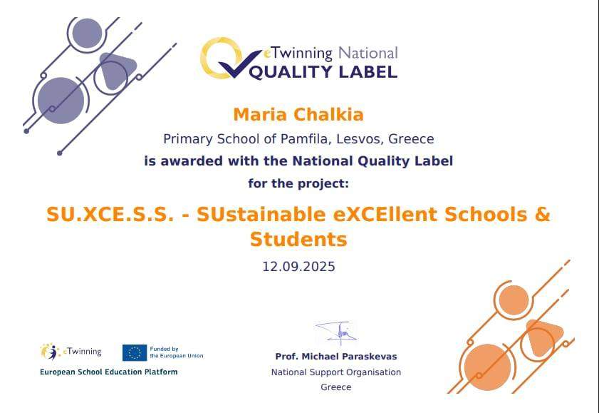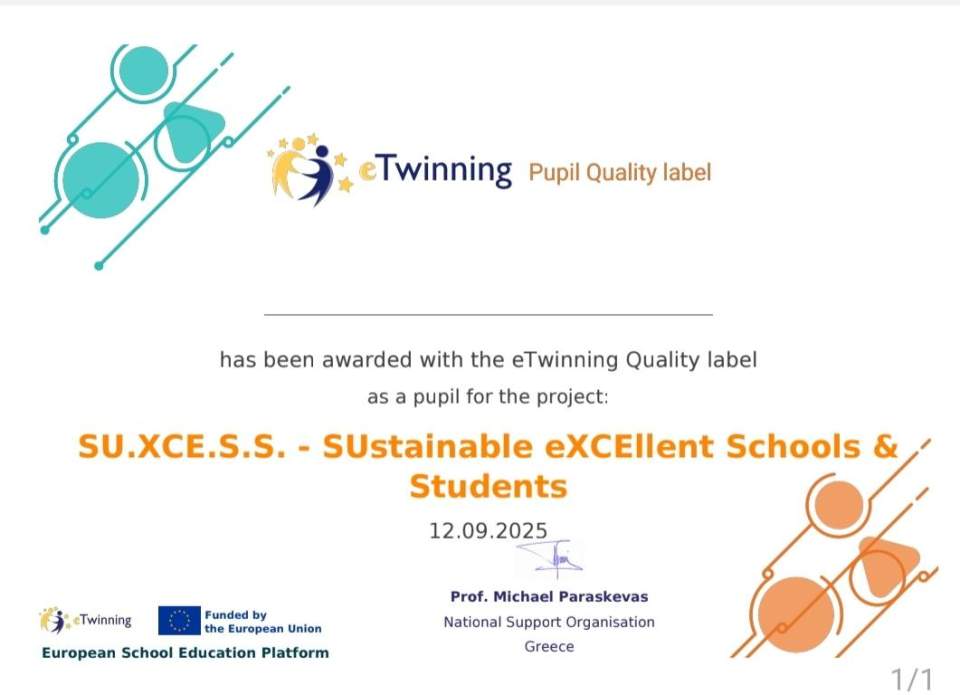 Παράλληλα, οι εκπαιδευτικοί και οι μαθητές μας απέσπασαν Ετικέτες Ποιότητας για το περιβαλλοντικό μας eTwinning έργο, "SU.XCE.S.S.", αποδεικνύοντας ότι η προσπάθεια, η δημιουργικότητα και η ομαδικότητα οδηγούν σε σπουδαία αποτελέσματα.