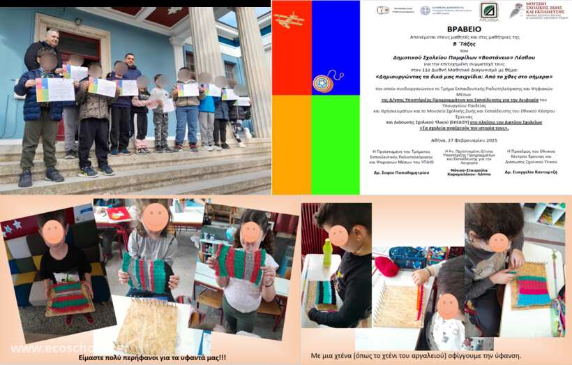28/2/2025-Βραβείο στους μαθητές/τριες της Γ' τάξης για την περσυνή συμμετοχή τους στον 11ο Διεθνή Μαθητικό Διαγωνισμό «Δημιουργώντας τα δικά μας παιχνίδια: Από το χθες στο σήμερα». Τα παιδιά μας απέσπασαν το βραβείο με το έργο τους που υπέβαλλαν πέρυσι στον διαγωνισμό. Κατασκεύασαν ένα παιχνίδι "κρεβατή- αργαλειό" όπου έφτιαξαν τα δικά τους υφαντά αναβιώνοντας έτσι την τέχνη του αργαλειού και το παιχνίδι με το οποίο απασχολούσαν δημιουργικά τα παιδιά τους οι γυναίκες παλιά. Ο διαγωνισμός, που συνδιοργάνωσαν το Μουσείο Σχολικής Ζωής και Εκπαίδευσης και το Τμήμα Εκπαιδευτικής Ραδιοτηλεόρασης του Υπουργείου Παιδείας, είχε στόχο να αναδείξει την ιστορία του παιχνιδιού και να δώσει την ευκαιρία στους μαθητές να αναπτύξουν τη δημιουργικότητα τους κατασκευάζοντας παλιά και σύγχρονα παιχνίδια.
