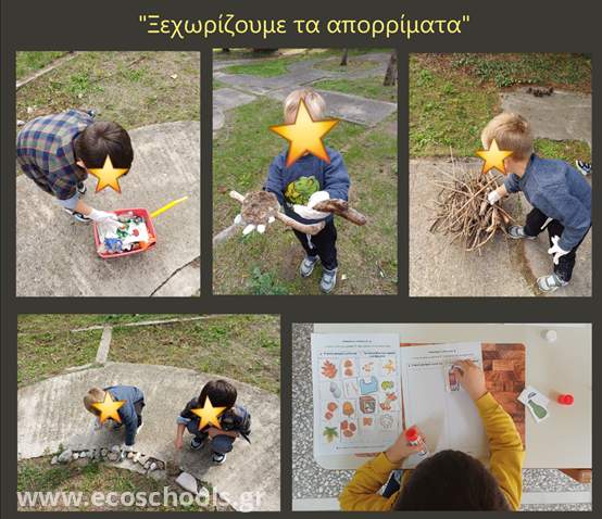 Καθαρίζουμε τακτικά την αυλή μας και το περιαστικό δάσος του σχολείου μας από τα σκουπίδια που βρίσκουμε. Αλλά τι πραγματικά αποτελεί σκουπίδι; Ποια σκουπίδια προέχονται από τον άνθρωπο; Ποια από αυτά που θεωρούμε σκουπίδια δημιουργούνται από την ίδια τη φύση; Και τι επιπτώσεις έχει το καθένα στο περιβάλλον; Πρώτα το συζητάμε στην τάξη. Μετά πηγαίνουμε στο πεδίο μελέτης και αναλαμβάνουμε δράση! Στο τέλος, αποτυπώνουμε σε ένα φύλλο εργασίας αυτά που μάθαμε θεωρητικά και πρακτικά. Αρχικά, κόβουμε τις εικόνες με τα "απορρίμματα", τα διακρίνουμε σε αυτά που παράγει ο άνθρωπος και σε αυτά που παράγει η φύση και τα κολλάμε στην αντίστοιχη στήλη. Στόχος της δραστηριότητάς μας είναι να προβληματιστούμε σχετικά με την προέλευση των απορριμμάτων και την αποσύνθεσή τους από το περιβάλλον, να διακρίνουμε τα είδη, να τα ταξινομήσουμε και να προτείνουμε λύσεις.
