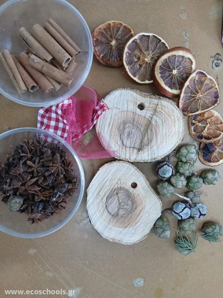 Παραμονή των εορτών και οι μαθητές μας αξιοποίησαν τα πολλά και διαφορετικά υλικά από την αυλή του σχολείου μας για να κατασκευάσουν γιορτινά στολίδια. Ένας πεσμένος κορμός ελιάς, τεμαχίστηκε σε λεπτές φέτες και επάνω οι μαθητές αυτοσχεδίασαν με αποξηραμένα πορτοκάλια, κουκουνάρια μικρά και μεγάλα, γλυκάνισο και ξυλάκια κανέλας. Το αποτέλεσμα ήταν μοναδικά στολίδια που μας υπενθυμίζουν την επαναχρησιμοποίηση των υλικών σε μία κυκλική οικονομία. Καλές γιορτές!
