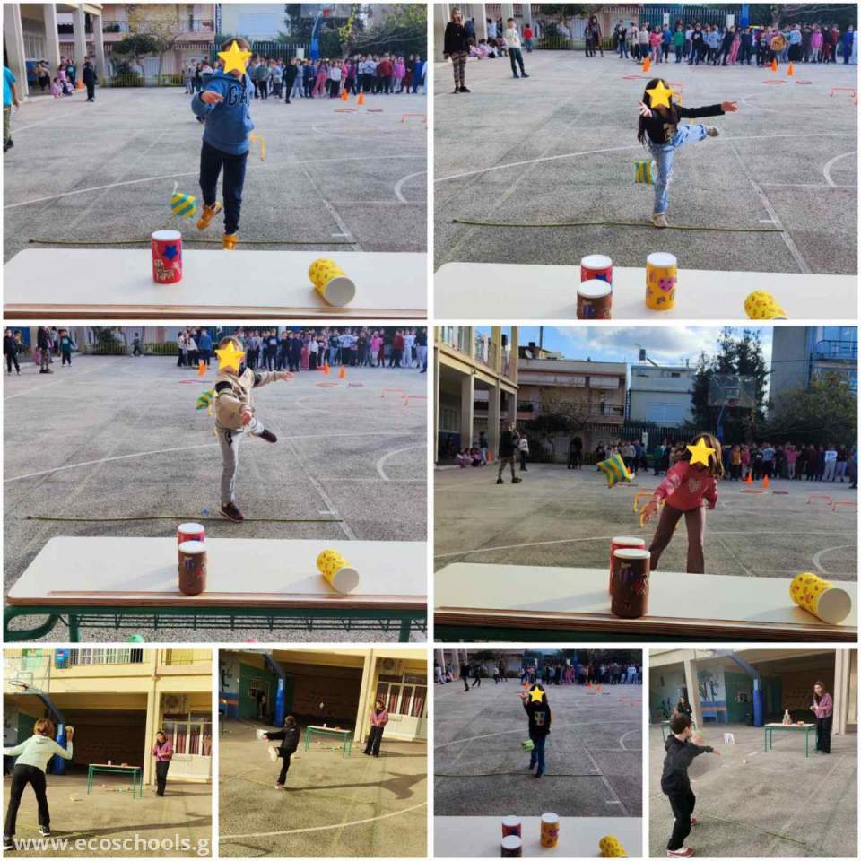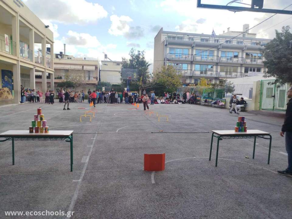 Οι μαθητές, χωρισμένοι σε τάξεις, συμμετείχαν σε μια διαδρομή με σταθμούς, κατά την οποία μετέφεραν καπάκια και τα τοποθετούσαν στο κουτί της ανακύκλωσης, ξεπέρασαν κινητικά εμπόδια, έχτισαν μια χριστουγεννιάτικη πυραμίδα και στο τέλος την αποδόμησαν.