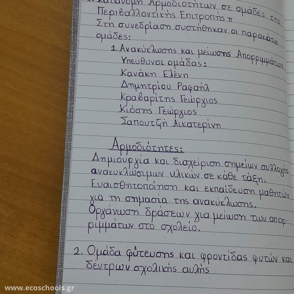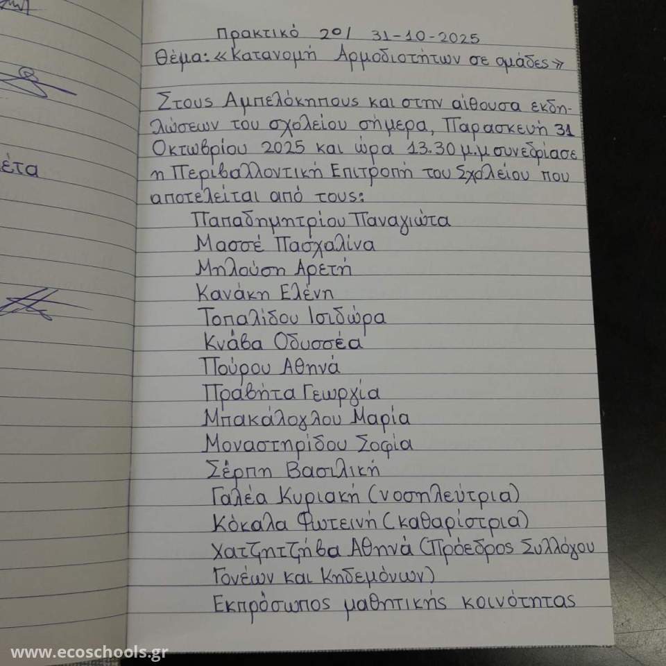 Στις 31 Οκτωβρίου 2025 συνεδρίασε η Περιβαλλοντική Επιτροπή του σχολείου και  προέβη σε κατανομή αρμοδιοτήτων στις ομάδες εργασίας.