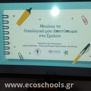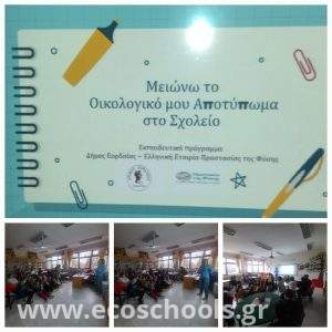 Οι μαθητές και οι μαθήτριες του σχολείου μας συμμετείχαν σε μια ιδιαίτερα ενδιαφέρουσα και ουσιαστική δράση με τίτλο «Μειώνω το οικολογικό μου αποτύπωμα στο σχολείο», η οποία υλοποιήθηκε σε συνεργασία με τον Δήμο Εορδαίας στο πλαίσιο της περιβαλλοντικής εκπαίδευσης και της συνεργασίας του Δήμου Εορδαίας με την Ελληνική Εταιρία Προστασίας της Φύσης (ΕΕΠΦ) και είχε στόχο να αναδείξει τη σχέση των καθημερινών μας επιλογών με την προστασία του περιβάλλοντος.
