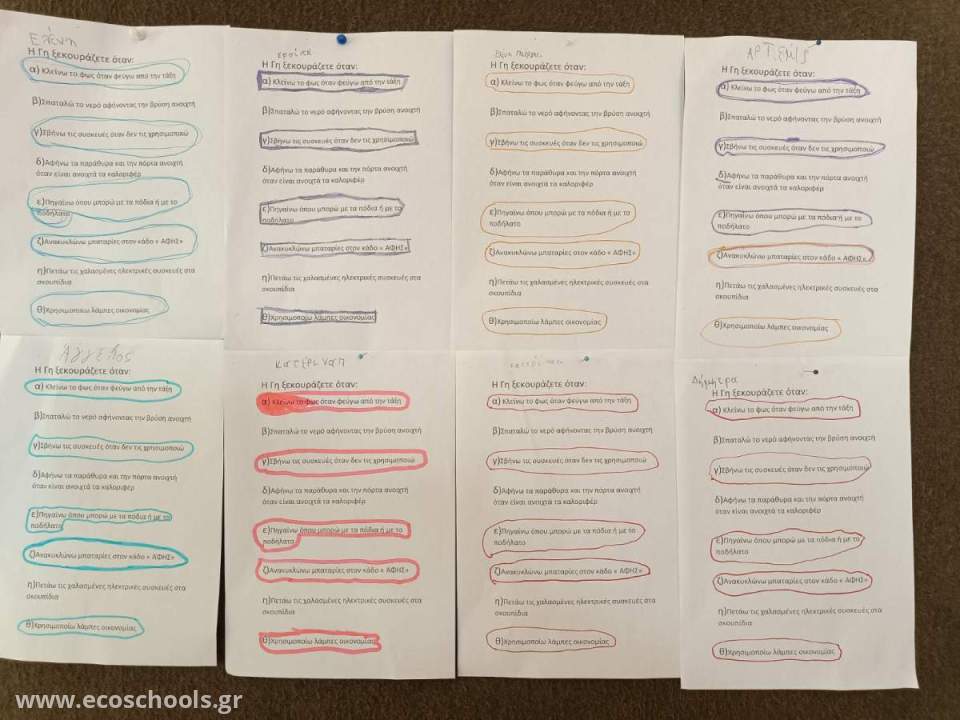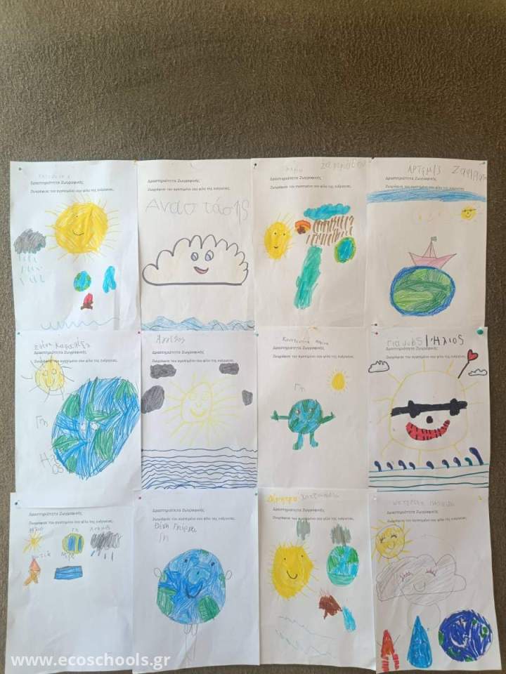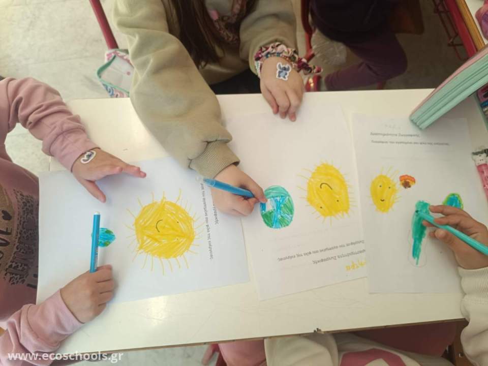 Οι μικροί μαθητές ζωγράφισαν τον αγαπημένο τουςήρωα ενέργειας, εκφράζοντας με χρώματα καιφαντασία τη σημασία της καθαρής ενέργειαςγια τον πλανήτη μας. Τέλος πραγματοποίησανμιαεργασίαεπιλόγης, κυκλώνονταςτη σωστή απάντηση στην ερώτηση : «Πότε η Γη ξεκουράζεται;», κατανοώνταςτη σημασία της εξοικονόμησης ενέργειας και της προστασίας του περιβάλλοντος.