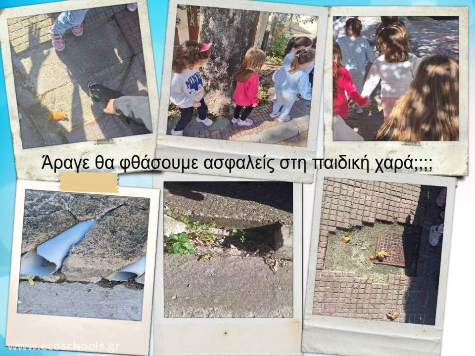 Το ερέθισμα για την εκκίνηση του σχεδίου δράσης δόθηκε από μια επίσκεψη που οργανώσαμε με τους μαθητές/τριες στη παιδική χαρά της γειτονιάς μας. Γυρίζοντας στο σχολείο και κάνοντας έναν απολογισμό της επίσκεψης οι μαθητές/τριες εξέφρασαν τον προβληματισμό τους για αυτά που διαπίστωσαν: "Γιατί δεν χωρούσαμε να περπατήσουμε δυο -δυο όπως μας έβαλαν οι κυρίες στο πεζοδρόμιο και έπρεπε να κάνουμε τρενάκι ο ένας πίσω από τον άλλον, Γιατί υπήρχαν σπασμένα πλακάκια στο πεζοδρόμιο , Πώς βρέθηκαν τόσα σκουπίδια στη παιδική χαρά και τι κινδύνους μπορεί να προκαλέσουν, Γιατί κάποιες κούνιες ήταν χαλασμένες, ποιος τις χάλασε και γιατί, Τι μπορούμε να κάνουμε»; Όλες αυτές οι σκέψεις μας προβλημάτισαν και αποτέλεσαν θέμα συζήτησης στην ολομέλεια της τάξης μας.