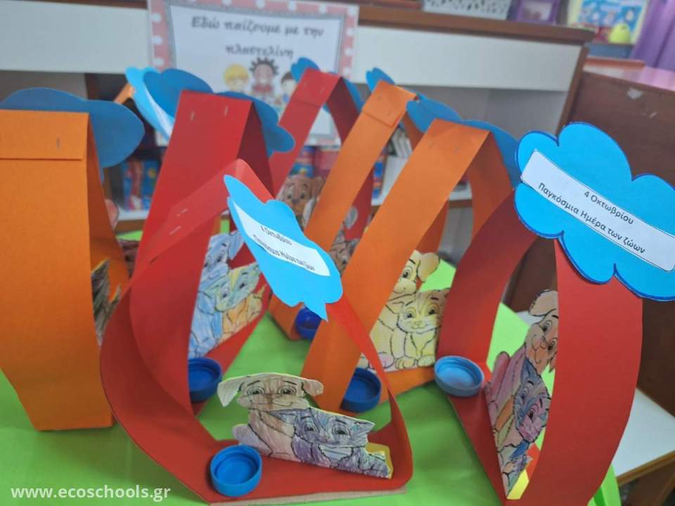 Κατασκευάζουμε από ανακυκλώσιμα υλικά στέγη για σκυλάκια καθώς αποδείχθηκε μετά από έρευνα το δημοφιλέστερο ζώο στην ομάδα μας. Τα ζώα όμως όπως και οι άνθρωποι έχουν κι αυτά δικαιώματα γι αυτό και ζωγραφίζουμε σχετικά μια αφίσα , την οποία τοιχοκολλήσαμε στον φελοπίνακα της τάξης για διάχυση στους επισκέπτες της σχολικής μας μονάδας.