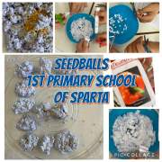 Οι μαθητές/ τριες του Ε'1 Τμήματος δημιούργησαν μπάλες σπόρων( seedballs) από χαρτιά που είχαμε χρησιμοποιήσει ξανά στην τάξη και δεν τα χρειαζόμασταν πια. Αρχικά, έκοψαν τα χαρτιά σε μικρά κομμάτια, τα ανακάτεψαν καλά μέσα σε ένα μπολάκι με νερό και στη συνέχεια τα πολτοποίησαν χρησιμοποιώντας μπλέντερ. Έπειτα, έριξαν μέσα στον πολτό σπόρους και δημιούργησαν μικρές μπάλες σπόρων. Στη συνέχεια, αφού τα άφησαν να αφυδατωθούν, βγήκαμε στην αυλή του σχολείου και τα φυτέψαμε στο παρτέρι του σχολείου.