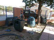 Μετά την πολύ ενδιαφέρουσα ενημέρωση του κ. Σμάγα για την κομποστοποίηση, ρωτήσαμε και μάθαμε ότι στο κτήριο του πρώην Δημαρχείου υπάρχουν κάδοι κομποστοποίησης που μας περιμένουν... Πήραμε τα κομμάτια τους, τα συναρμολογήσαμε και τα στήσαμε στο χώρο όπου φιλοδοξούμε να δημιουργήσουμε το φυτώριό μας.